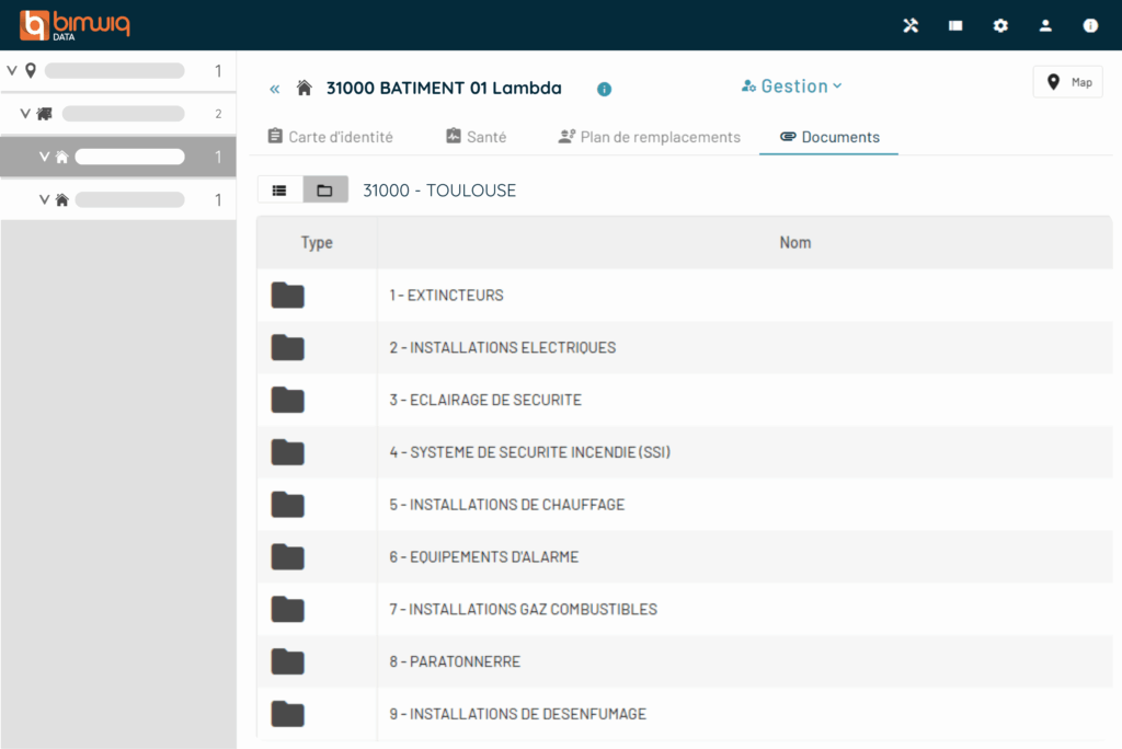 La gestion des documents dans bimwiq DATA permet d’importer et de classer vos fichiers, de les associer aux espaces et équipements.