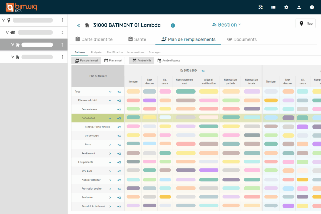 Vous visualisez en un coup d’œil l’état de vos bâtiments, avec le taux d’usure, les éléments vétustes et les alertes critiques.